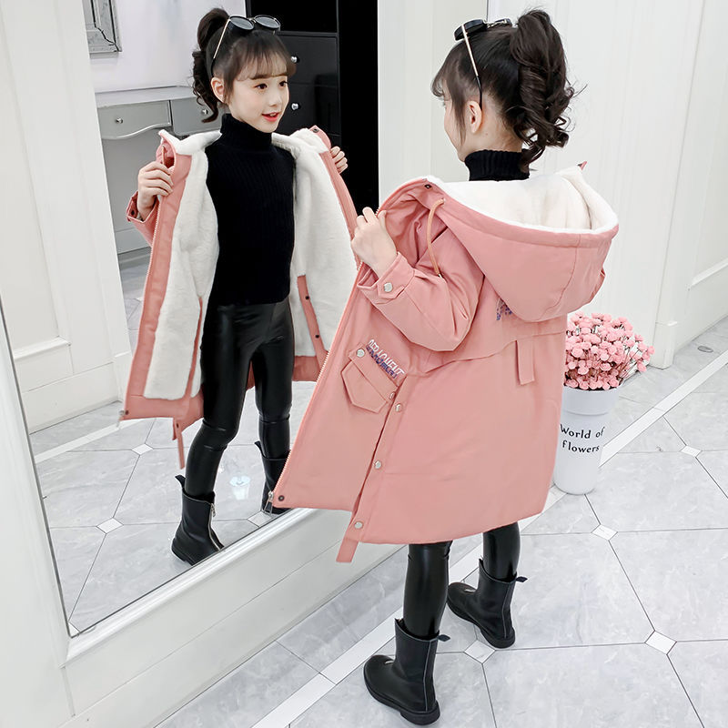 2023 girls' winter cotton jacket with plush and thick coat, medium length, medium to large children's clothing style, overcoming girls' foreign style cotton jacket
