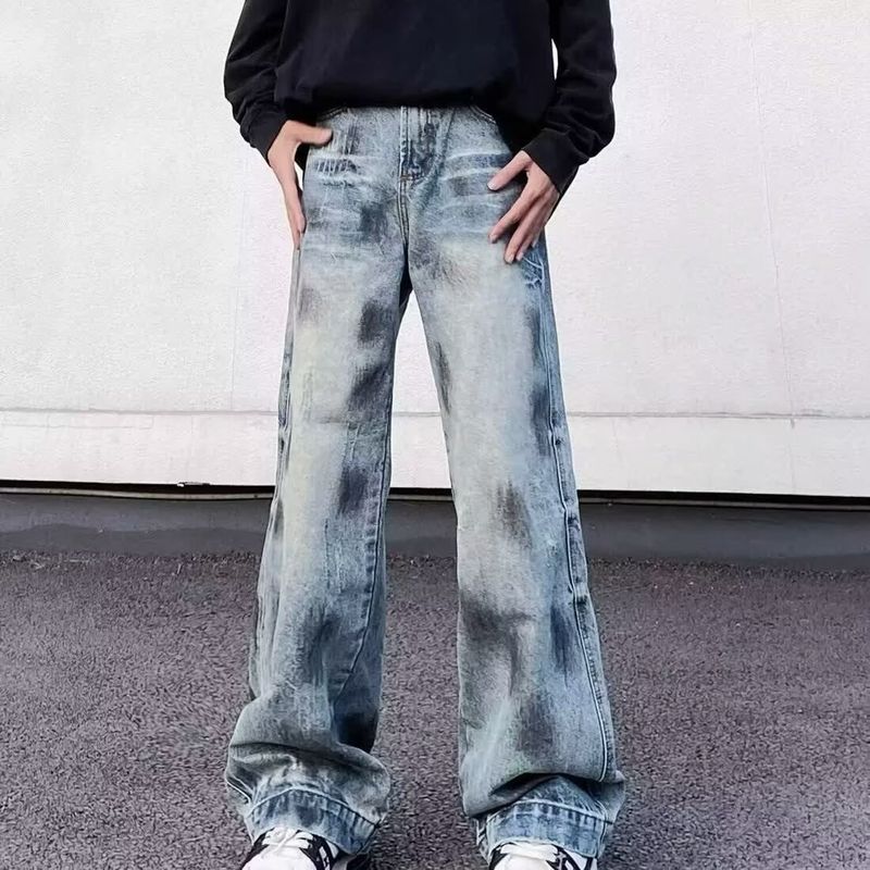 2024 American Style Dirty Graffiti Distressed Jeans For Men With Loose And Versatile Design, Straight Wide Leg Pants
