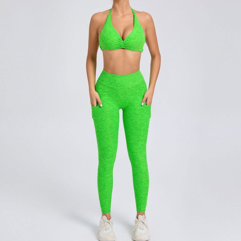 Autumn Halter Neck Side Pocket Color Block Tight Yoga High Waist Quick-Dry Running Sports Fitness Two-Piece Set