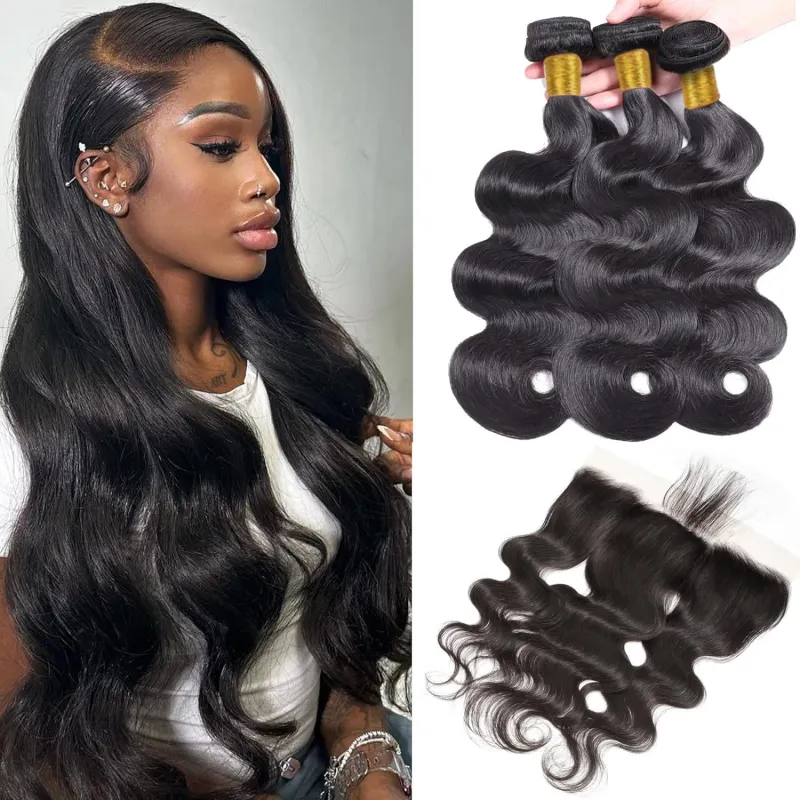Brasiliansk jomfru menneskehår kropsbølgebundter frontal 3 bundter blonder frontal 4x4 lukning 1B