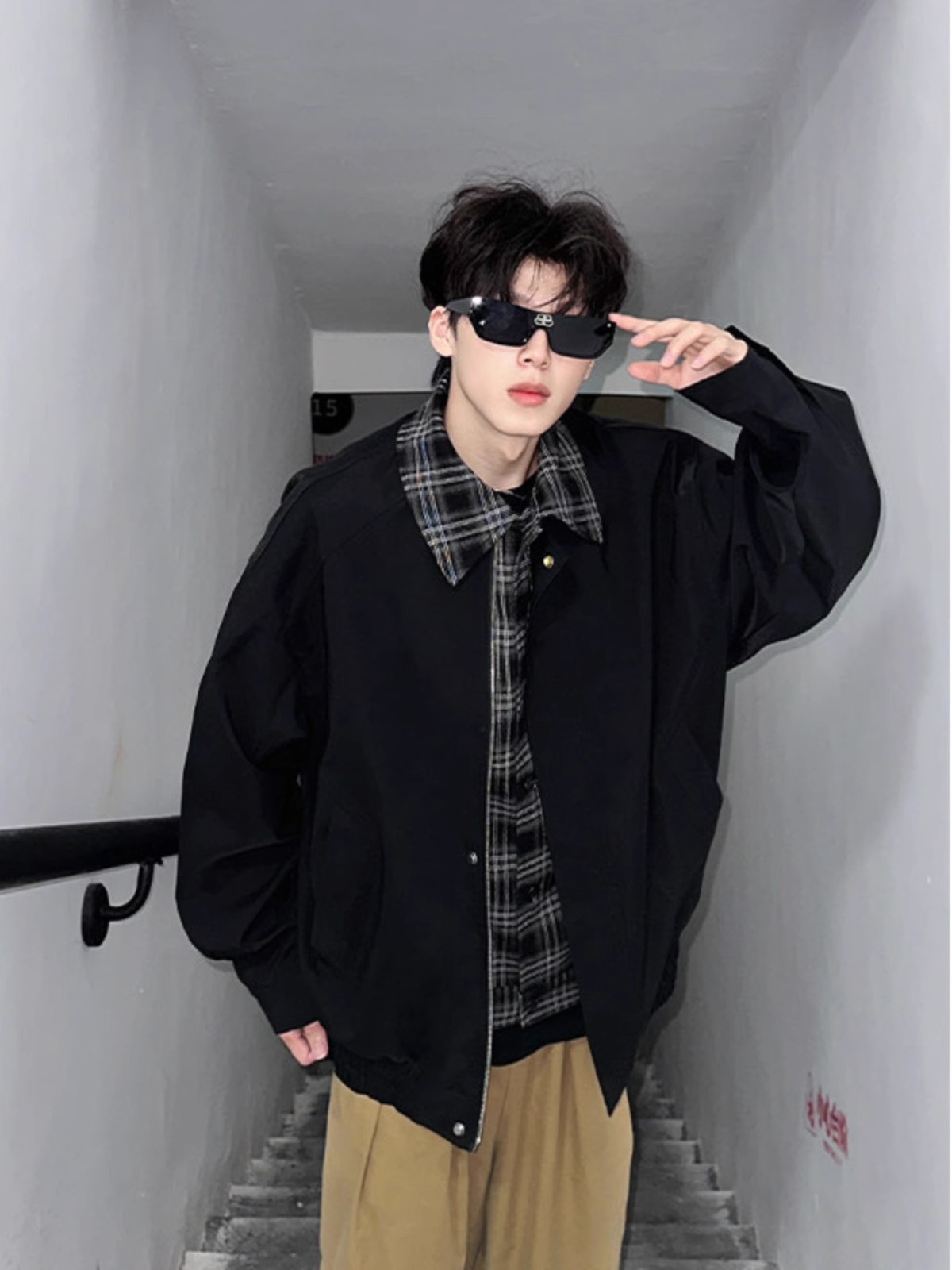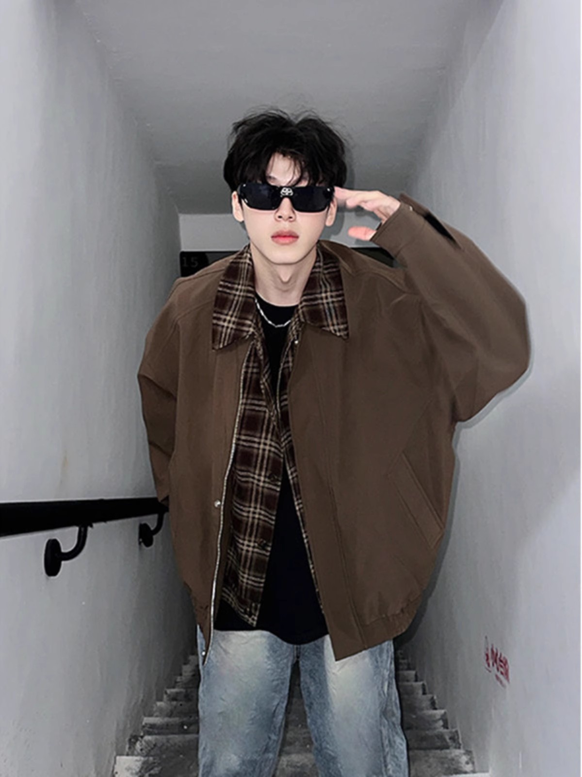 Casual and cool workwear plaid lapel patchwork jacket, men's trendy loose jacket