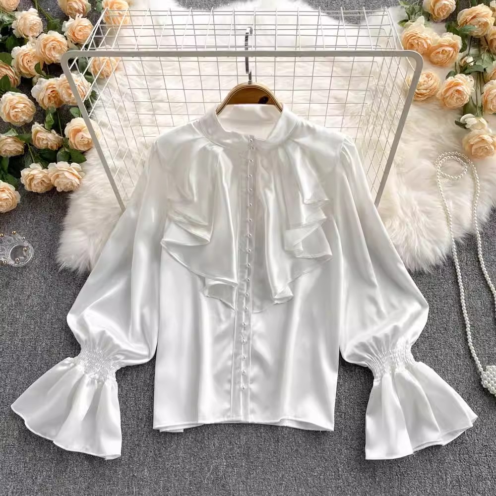Chic GraceChic GraceChic GraceChic Foreign Trade French High-End Shirt For Women With Ruffled Stand Collar, Single-Breasted Sweet And Elegant Lantern