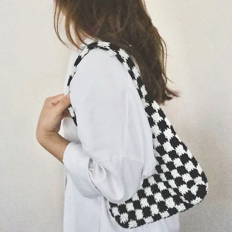 Finished Checkerboard Color-Block Shoulder Underarm Bag Handmade Yarn Material Woven Versatile Fashion Women's Shoulder Bag
