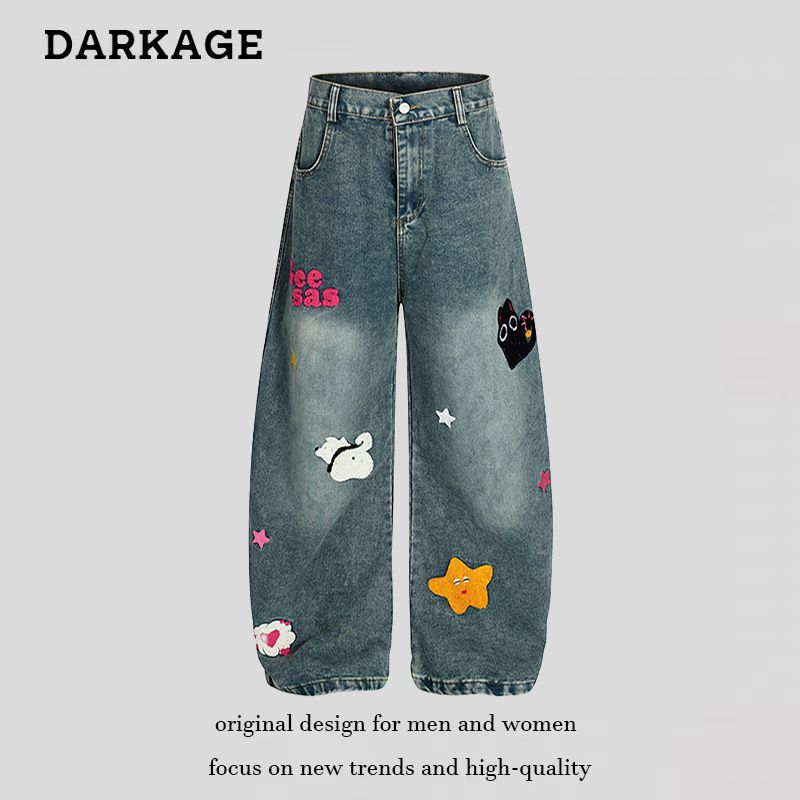 Fun Cartoon Towel Embroidered Scimitar Jeans for Men and Women 2025 New Loose Straight Lazy Style Wide-Leg Pants