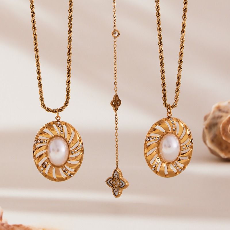 Crafted with meticulous attention to detail, each layer offers unique textures and accents. The central pearl pendant with intricate cutouts and the clover charms deliver a mix of sophistication and whimsy. Whether worn as a set for a cohesive, head-turning look or paired with simpler pieces to let the layers shine, this necklace infuses your style with confidence, glamour, and effortless chic.