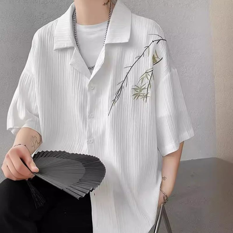 Ice silk Cuban collar white shirt short sleeved men's summer bamboo leaf embroidery new Chinese style design, high-end linen shirt