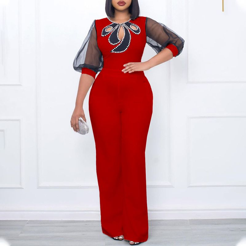 Women's Short Bubble Sleeve Bodysuits S-3XL Studded Beads Sexy Wide Leg Waist Wrapped Large Jumpsuit