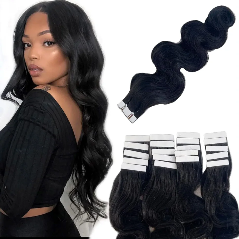 Naturlig sort tape i hårextensions til sorte kvinder, ægte hår, kropshud, vævningstape i hårextensions