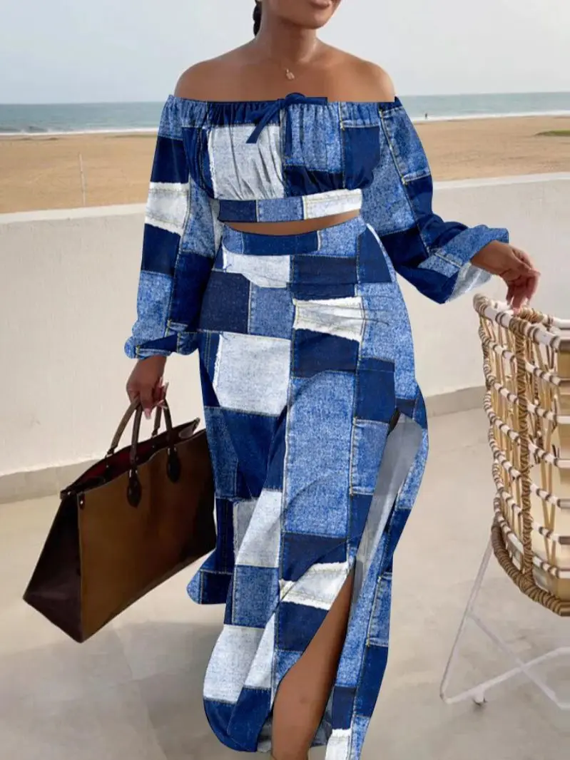 Summer Women's New D Fashionable Print Bra Long Sleeve Top Split Half Skirt Casual Temperament Elegant Women's