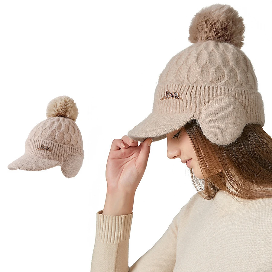 Thick Rabbit Hair Ear Protection Baseball Cap Women's Winter Outdoor Cold-Proof Warm Hair Ball Knitted Cap Skullies Beanies